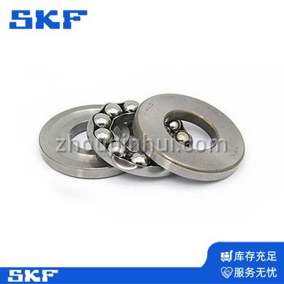 SKF推力球轴承是一种分离型轴承,轴圈、座圈可以和保持架、钢球的组件分离。轴圈是与轴相配合的套圈,座圈是与轴承座孔相配合的套圈,和轴之间有间隙;推力球轴承只能够承受轴向负荷,单向推力球轴承是只能承受一个方向的轴向负荷,双向推力球轴承可以承受两个方向的轴向负荷;推力球轴承不能限制轴的径向位移,极限转速很低,单向推力球轴承可以限制轴和壳体的一个方向的轴向位移,双向轴承可以限制两个方向的轴向位移。